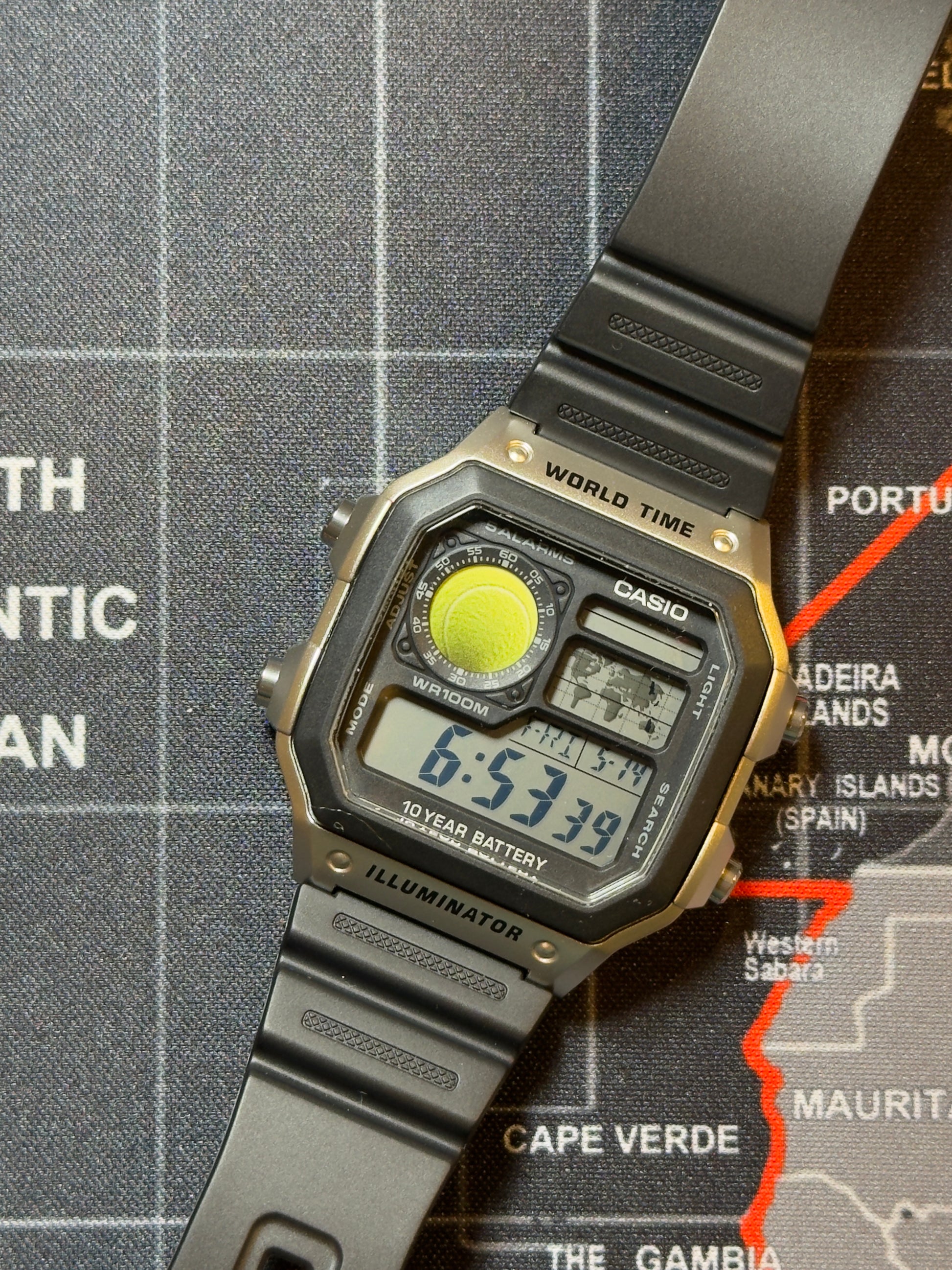 The AE-1200 features a distinctive multi-display design with unique digital elements, including an analog-style LCD inspired by instrument panels and a world map display. Designed for practical performance, it offers approximately 10 years of battery life and 100-meter water resistance.